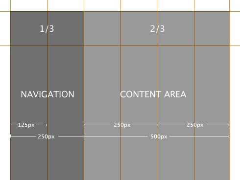 The design for my site is built around around a very simple grid system. Once I had my grid, I used photoshop to comp together the designs positioning any elements exactly on the grid lines. The grid was designed intially for a content and navigation area based on the Rule of Thirds (which is roughly approximated around the Golden Section), the dimensions of which are 250px and 500px respectively. The content area is then subdivided into two 250px columns.