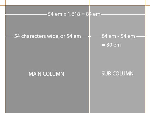 As mentioned earlier, our ideal minimum width for the measure is 52 em. This is the width of our main column and as determined by the Golden Section, the overall column widths combined is 1.62 multiplied by 52 em, which is 84 em. The right column is therefore 84 em minus 52 em, which is 32 em. Converting these to percentages gives us 62% and 38%, which is what you use in the CSS for each column.