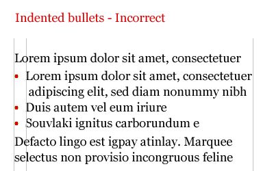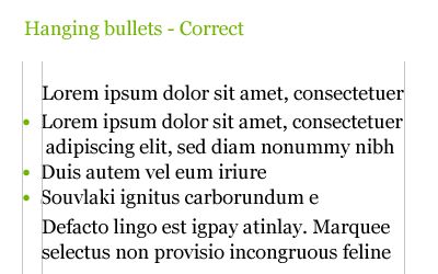 With hanging punctuation the flow of text on the left hand side is uninterrupted. The bullets, glyphs or numbers sit in the gutter to highlight the list. This representation of a list is more sophisticated visually and more legible.