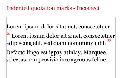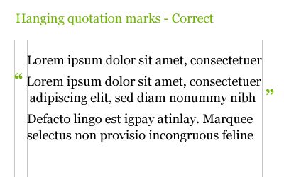 Quotation marks should be ‘hung’ - See diagram below. In this example the quotation marks are hung either side of the quote. Once again this allows uninterrupted reading for the audience.