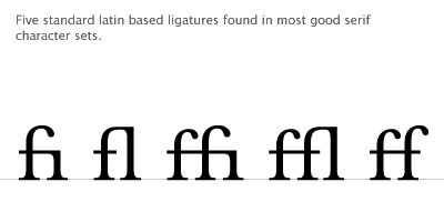 Ligatures and language have been closely tied throughout typographic history. Typographers in the sixteenth century devised ligatures to cope with common occurrances of letters in latin - fi, ffi, fl, ffl, ff (shown above). You will find at least a couple of these in most fonts. But, as langage has changed to encorporate different words, especially english, the need for more obscure ligatures has grown.