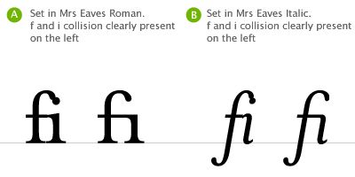 It’s when these overlaps collide with letters next to them that we have problems. Take lower case f and lower case i, probably the most widely used ligature. When set in Roman (A, above), the ascender of the f collides with the dot of the i, the effect is much worse when set in italic (B, above). Type designers therefore combined the character into the fi ligature. As you can see, the dot from the i is simply removed.
