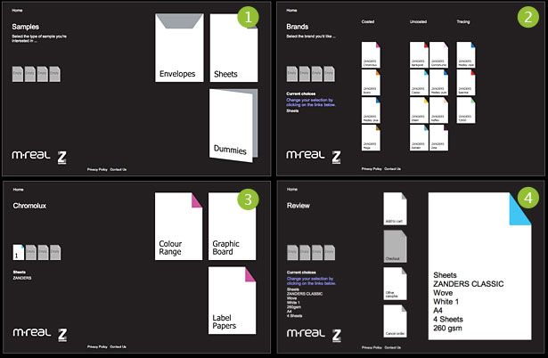 Most of the online sample ordering services I came across were simple shopping cart type functionality. For the most part, they worked well, but considering the breadth of most product ranges (in terms of size, colour, weight etc.), and the choices I had to make before ordering, the simple shopping cart soon became a monstrous list of links. Then I stumbled across the Zanders UK samples site.