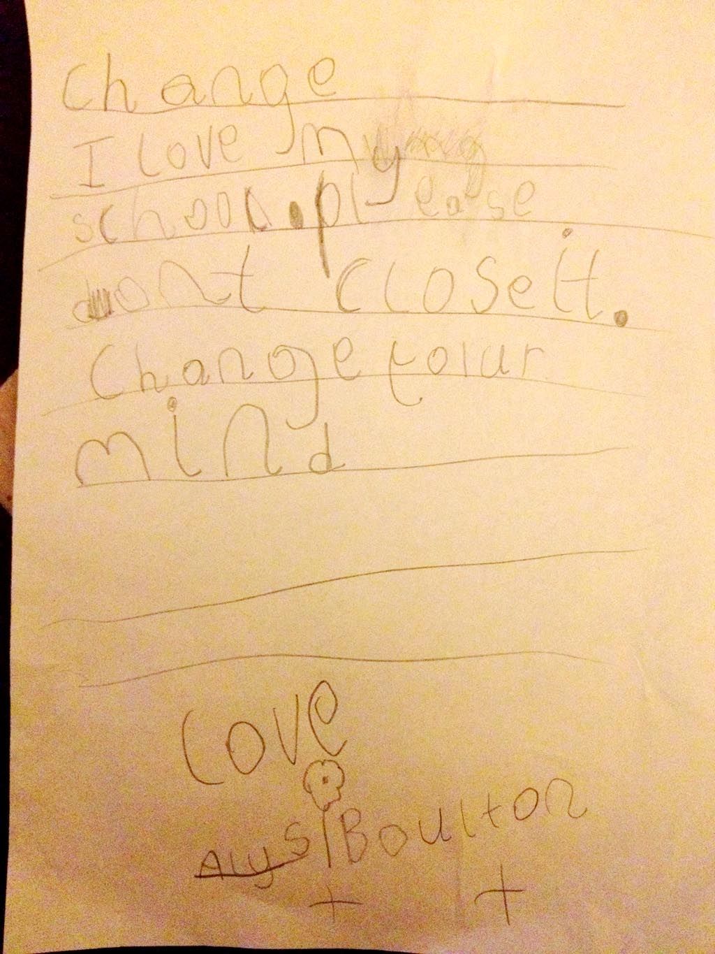Change. I love my school. Please don’t close it. Change your mind. Love, Alys Boulton.
